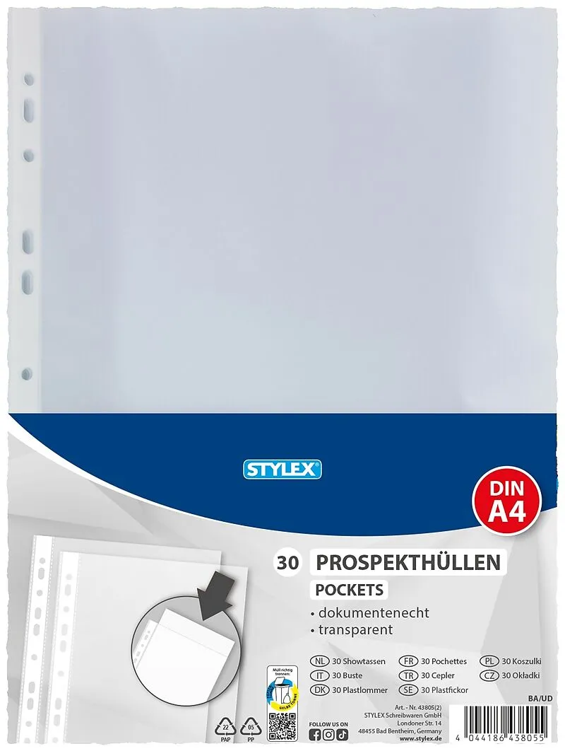 Prospekthüllen, DIN A4, 30er Beutel, genarbt, dokumentenecht, verstärkter Lochstreifen, mit Universallochung, oben offen, geeignet für 2er und 4er Ringmechanik