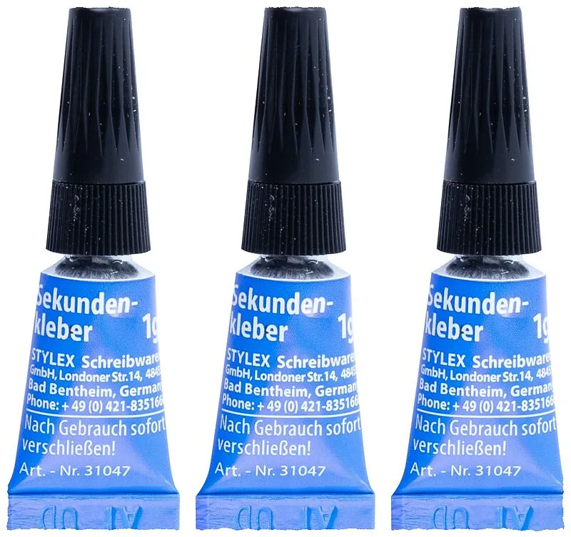 Sekundenkleber, 3 Tuben 1 g, flüssig, extra stark, geeignet für alle Materialien inkl. Glas, mit Ausnahme von PP, PE, PTFE, Teflon und Styropor, auf Blisterkarte