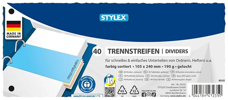 Trennstreifen, 10,5 x 24 cm - 8 cm gelocht, geschrumpft, 190 g/m, 40er Packung, farbig sortiert