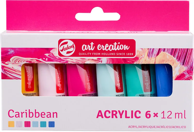 Talens Art Creation Acrylfarbe Set Caribbean | 6 x 12 ml Dieses Acrylfarben-Set mit 6 x 12-ml-Tuben bietet eine grossartige Grundpalette an sommerliche Farben, mit denen Sie verschiedene Gemälde erstellen können. Aufgrund der praktischen Grösse sind diese Tub...
