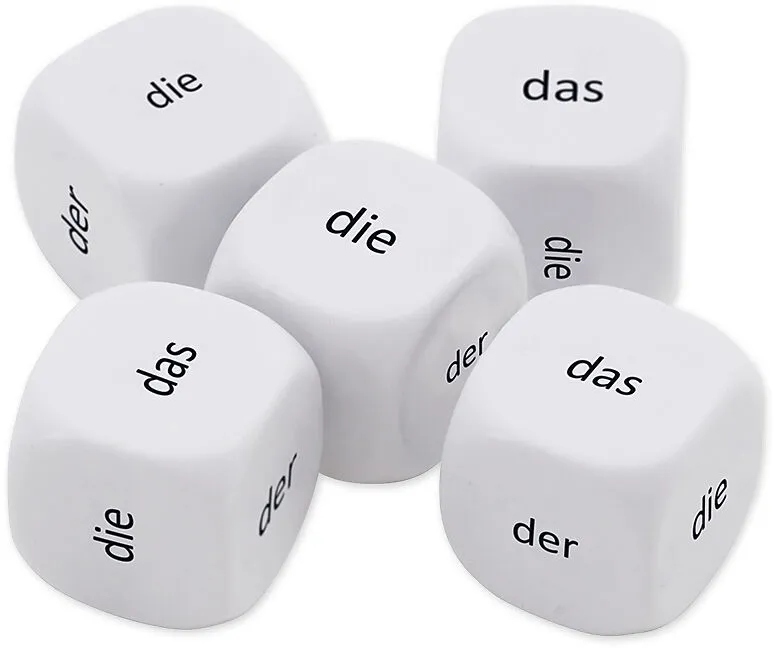 Lehrmaterial Auf diesen sechsseitigen Würfeln befinden sich die bestimmten Artikel. Nutzbar für den Deutsch-Unterricht und den Deutsch-Fremdsprachen-Unterricht. Die Würfel sind aus weissem Kunststoff mit abgerundeten Ecken und Kanten gefertigt. Die schwarze B...