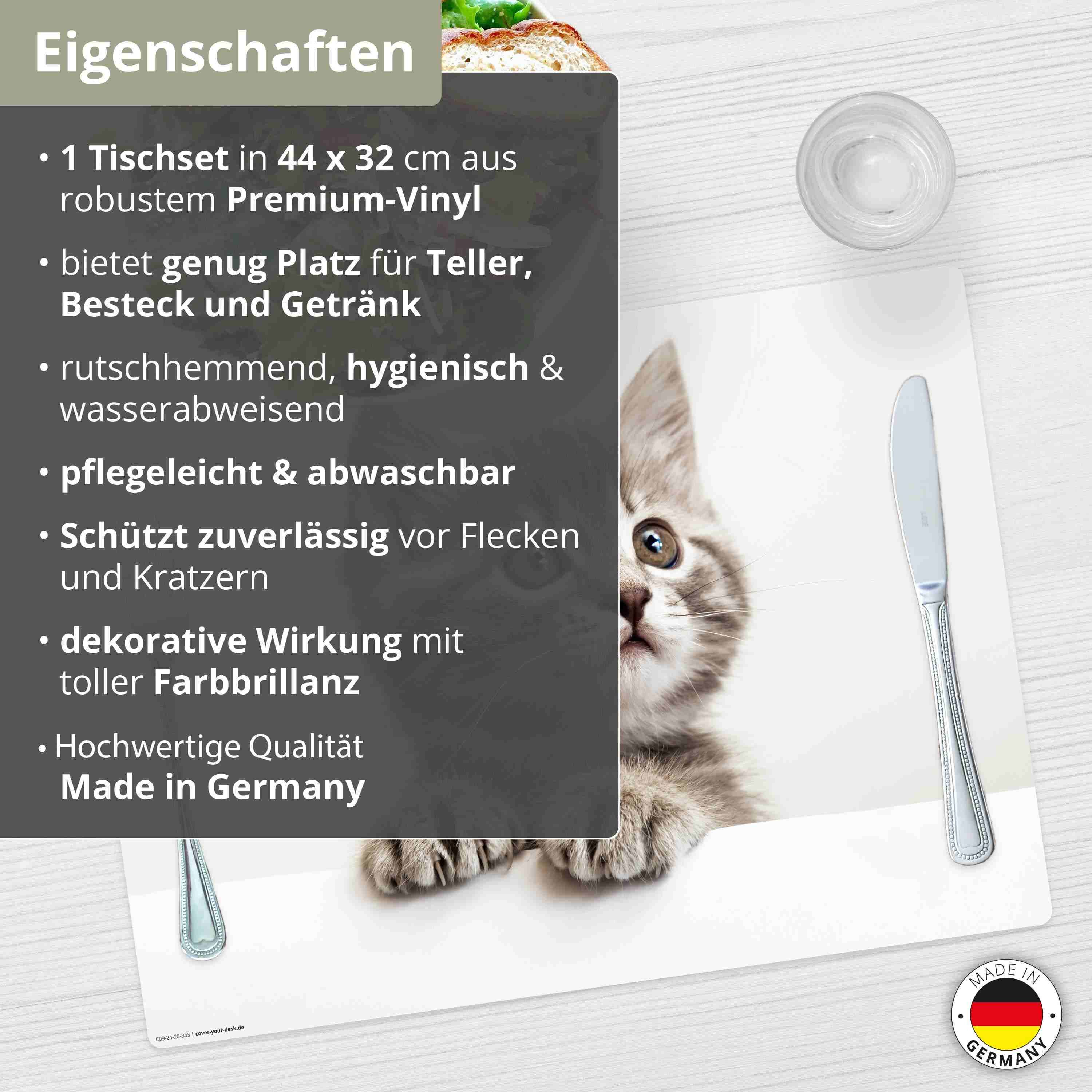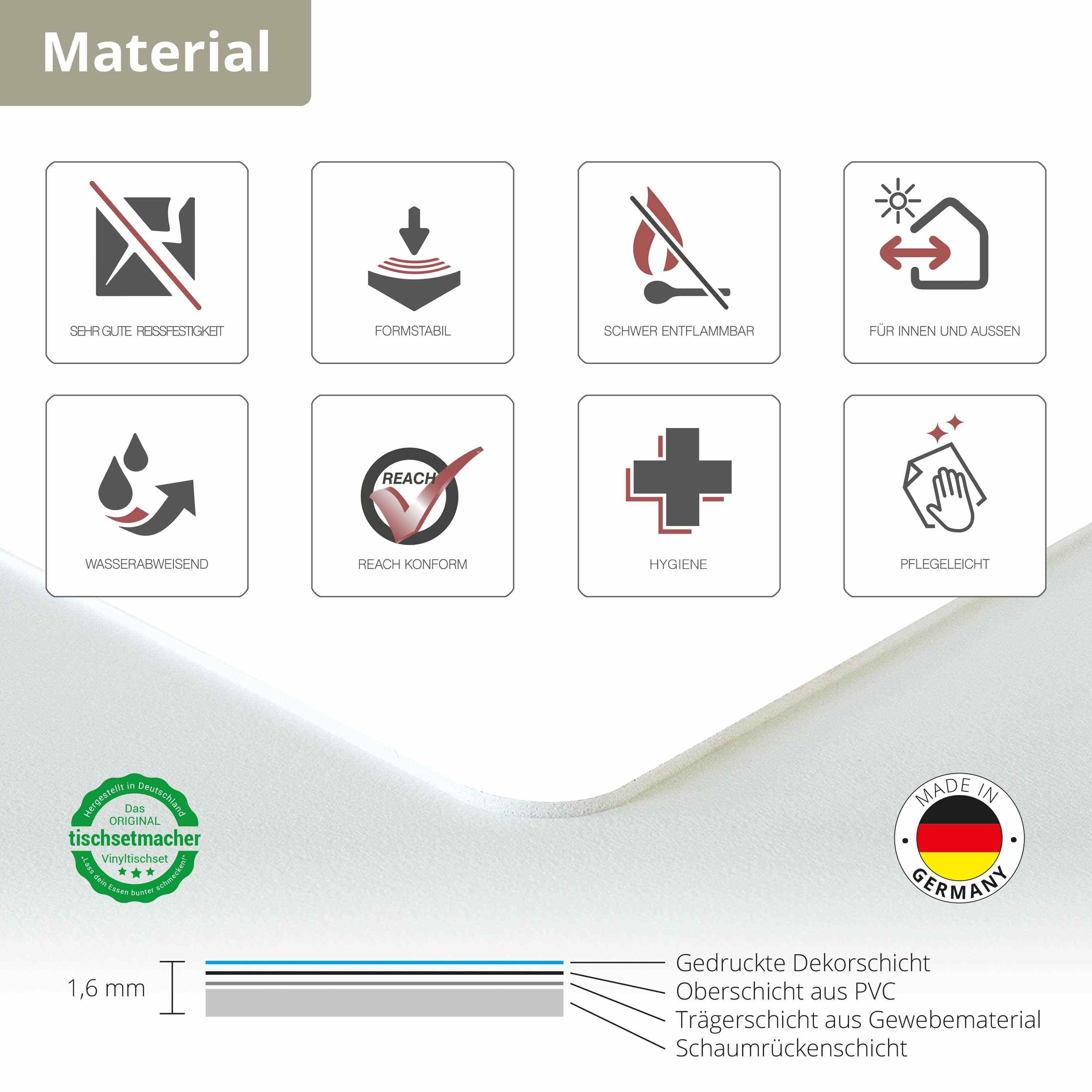 Diese Tischsets bestehen aus 1,6mm dickem, erstklassigem Premium Vinyl und werdenin Deutschland hergestellt. Die Sondergröße von 44 x 32 cm bietet ausreichend Platz für Teller, Besteck sowie Getränk. Die Platzmatten schützen den Tisch vor Verschmutzungen, Flü...
