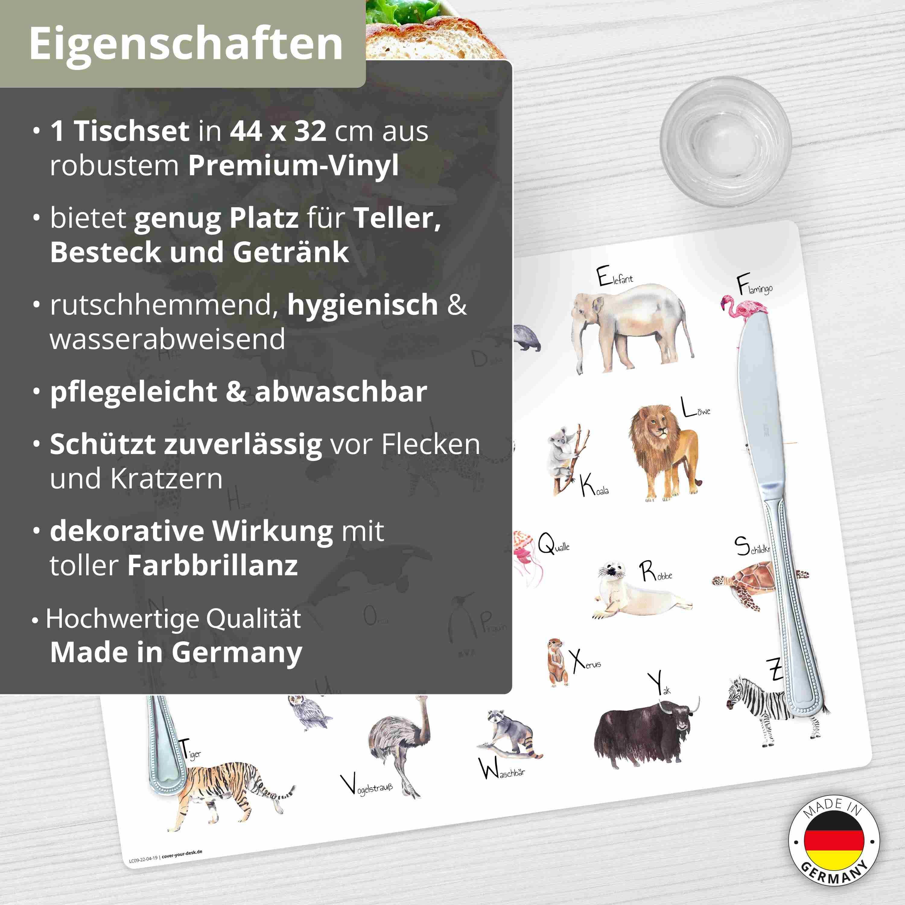 Diese Tischsets bestehen aus 1,6mm dickem, erstklassigem Premium Vinyl und werdenin Deutschland hergestellt. Die Sondergröße von 44 x 32 cm bietet ausreichend Platz für Teller, Besteck sowie Getränk. Die Platzmatten schützen den Tisch vor Verschmutzungen, Flü...