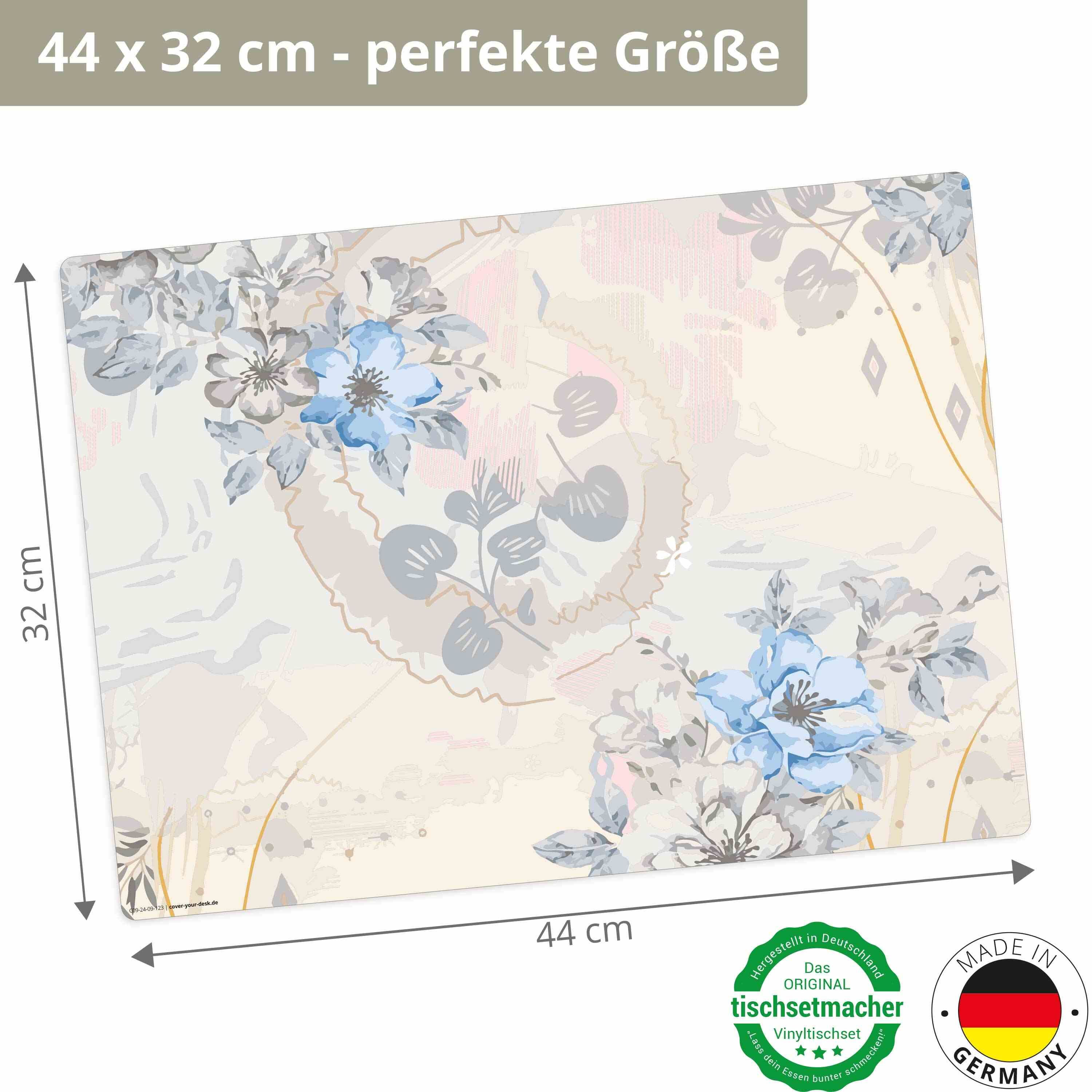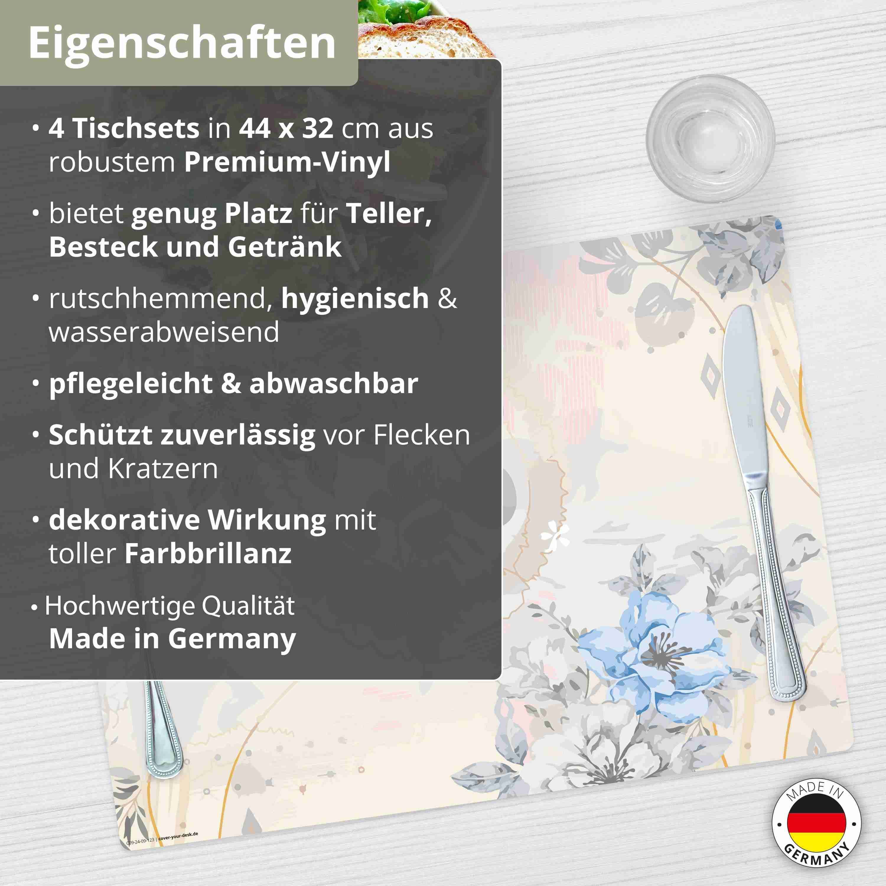 Diese Tischsets bestehen aus 1,6mm dickem, erstklassigem Premium Vinyl und werdenin Deutschland hergestellt. Die Sondergröße von 44 x 32 cm bietet ausreichend Platz für Teller, Besteck sowie Getränk. Die Platzmatten schützen den Tisch vor Verschmutzungen, Flü...