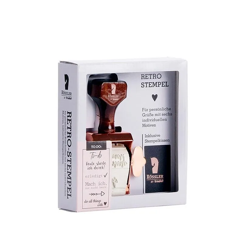 sechs individuellen Motiven, inklusive Stempelkissen. Rössler by Trodat.Durch Drehen der Flügelschraube wird ein Motiv ausgewählt.