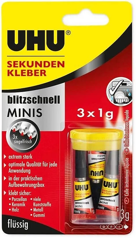 Sekundenkleber blitzschnell Minis Extrem starker Sekundenkleber- portioniert in 1 g Tuben, in der praktischen Aufbewahrungsbox. Optimale Qualität für jede Anwendung- 3x siegelfrisch. Aufgrund seiner Konsistenz fließt der Klebstoff in kleinste Ecken und Spalte...