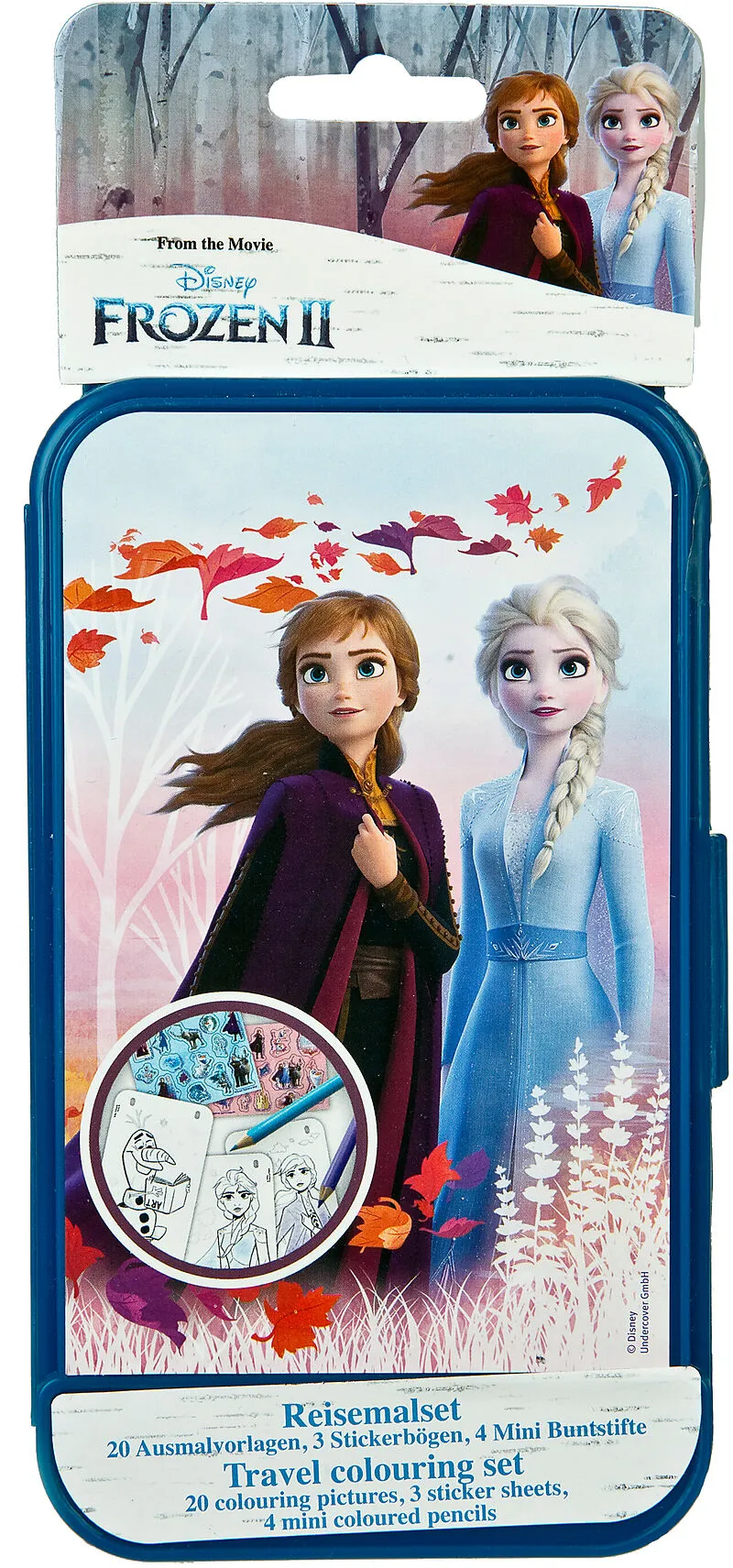 20 Ausmalvorlagen (9,40 x 17,00 cm), 3 Papierstickerbögen (10,20 x 7,60 cm), 4 Mini Buntstifte, in Mitnahmebox