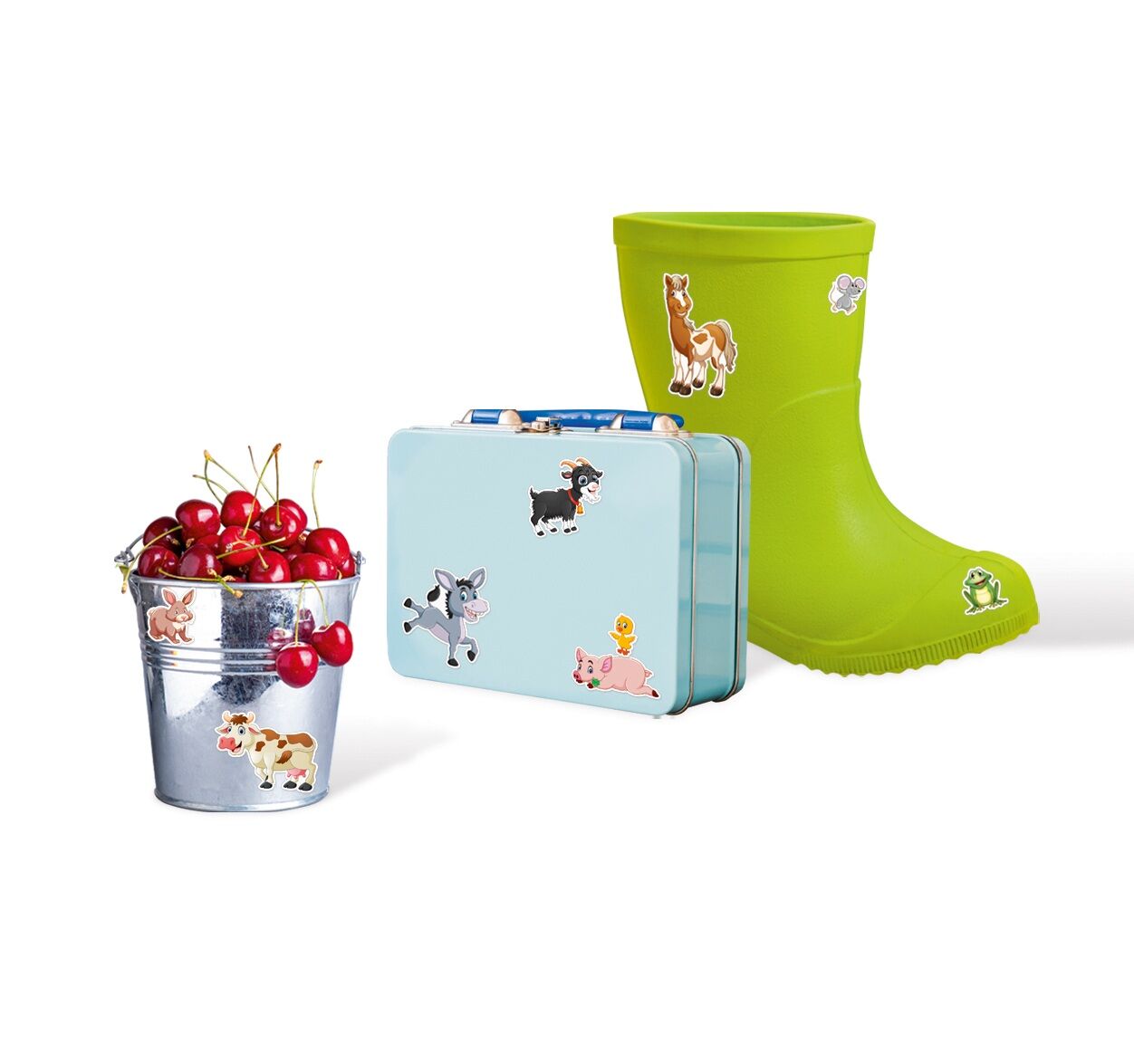 20 Sticker in verschiedenen Motiven (Größe: ca. 10 - 61 mm) Verpackuung mit Euro-Lochung. 1 selbstklebender Stickerbogen (10 x 16,5 cm) in verschiedenen Motiven und Größen