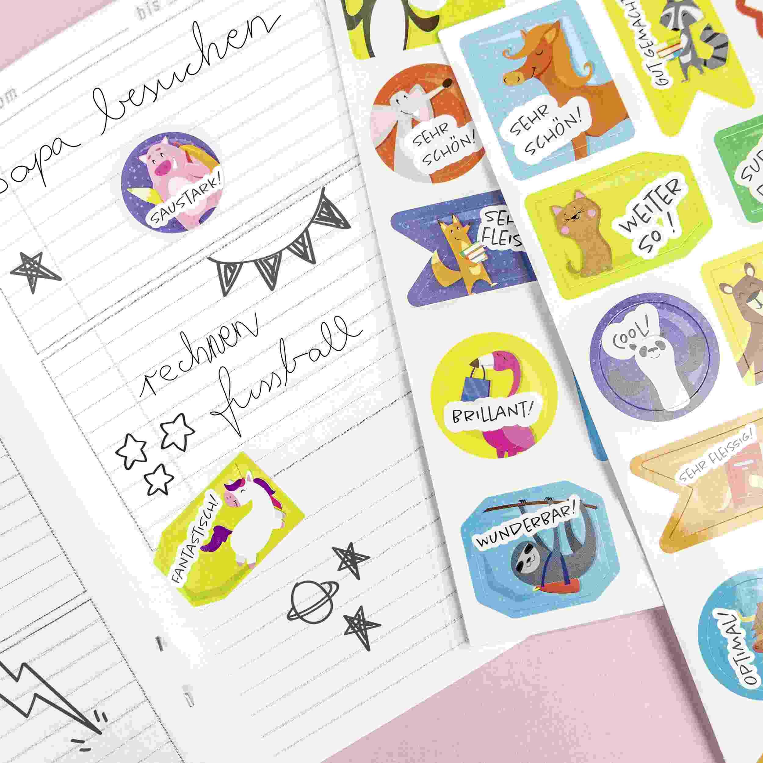 4 Stickerbögen (11,7 x 17,7 cm) mit 84 Stickern (selbstklebend und einseitig bedruckt)