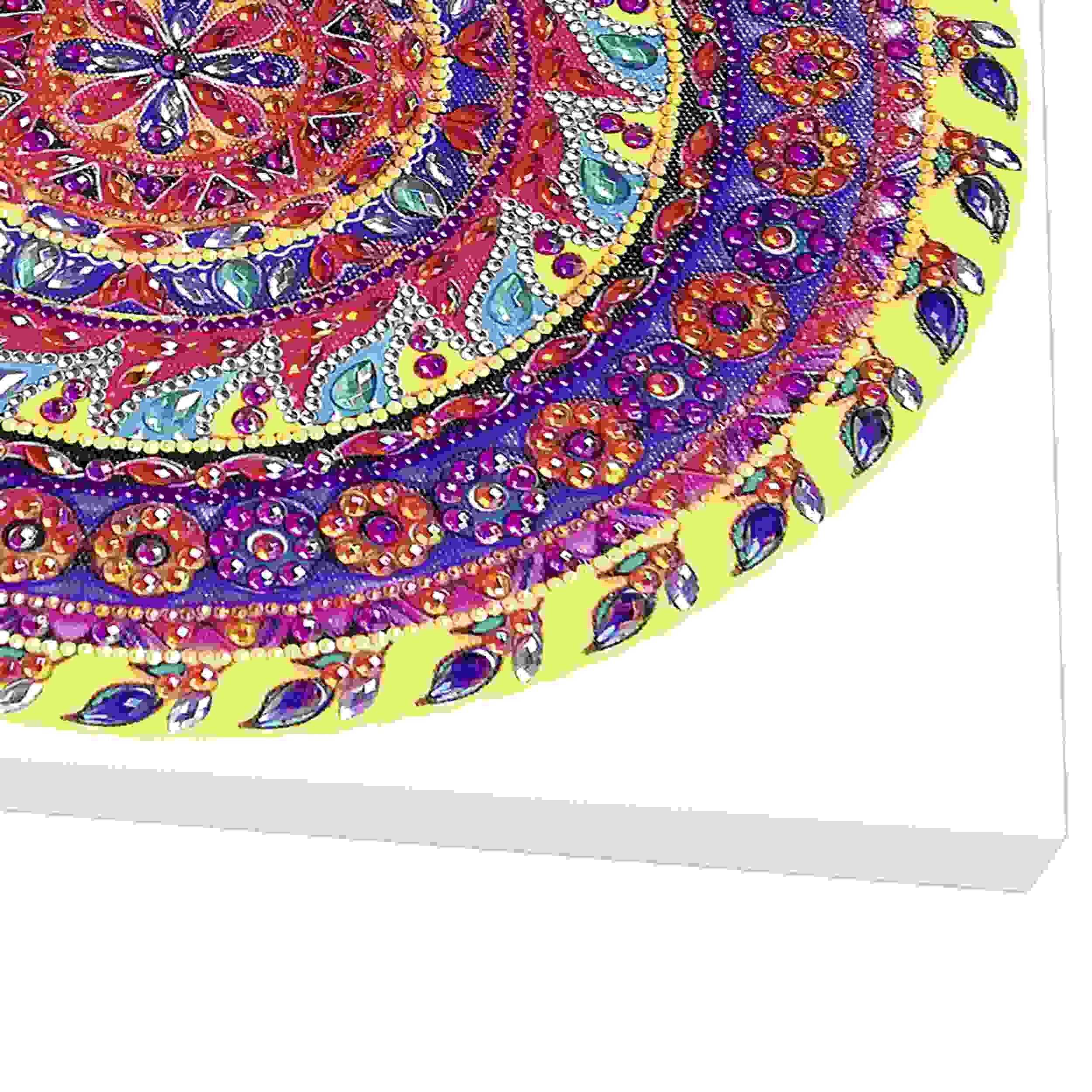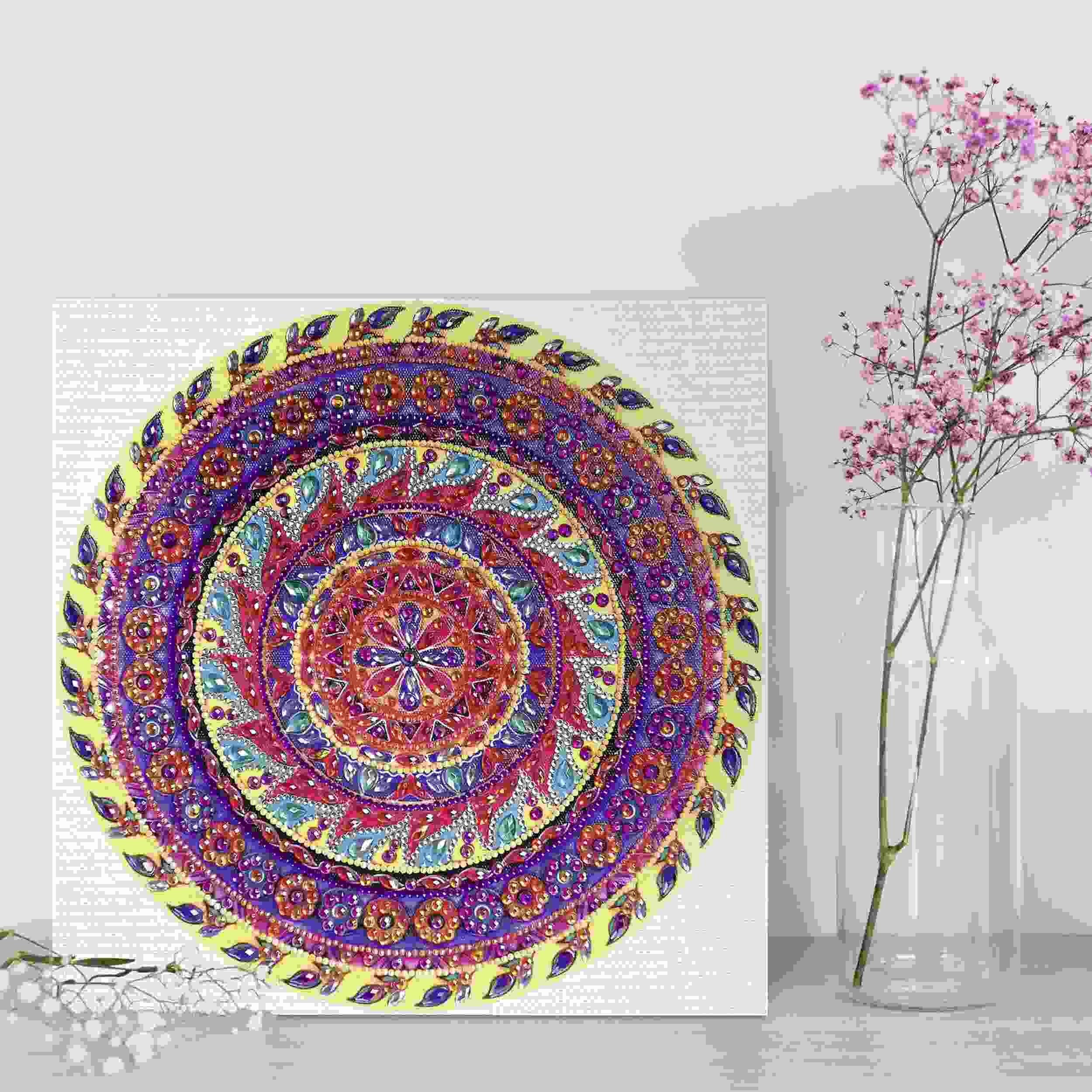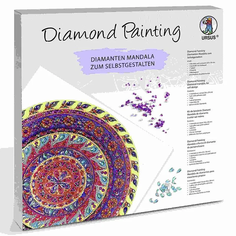 1 Mandala auf Leinwand (30 x 30 x 1,5 cm), 1 Steckstift mit Klebepad, 1 Tablett, 1 Pinzette, 1 Montageset und verschiedene Acryldiamanten.