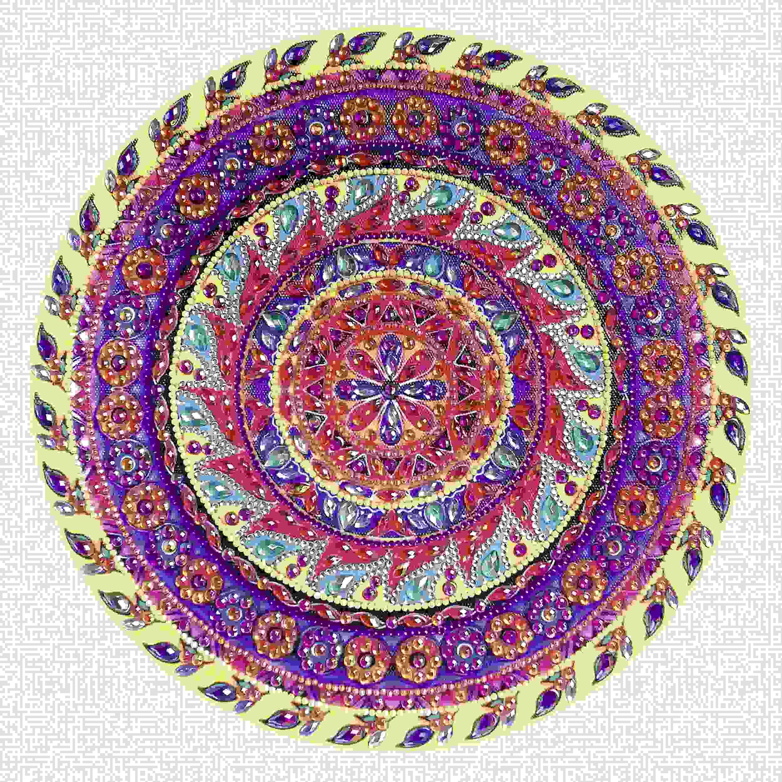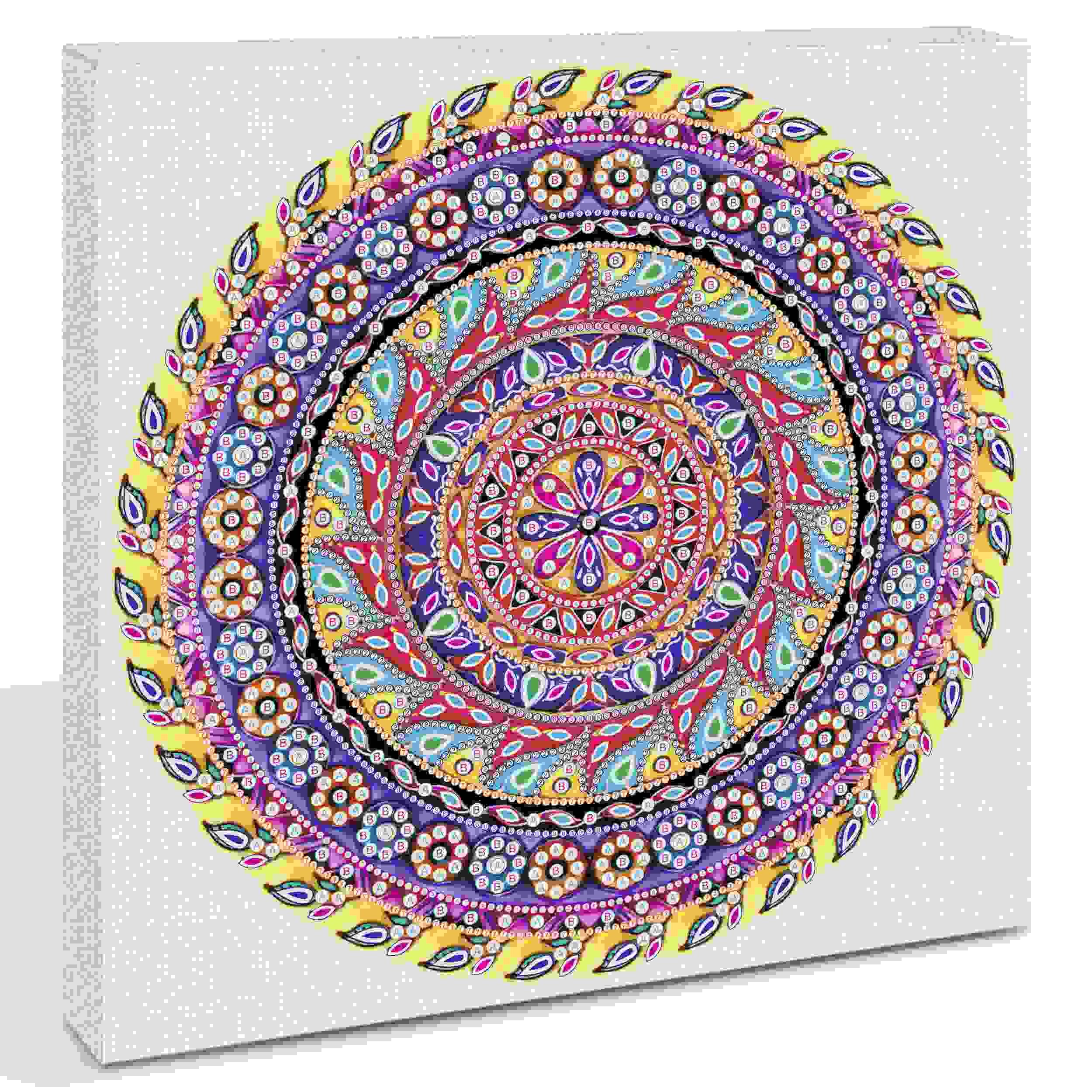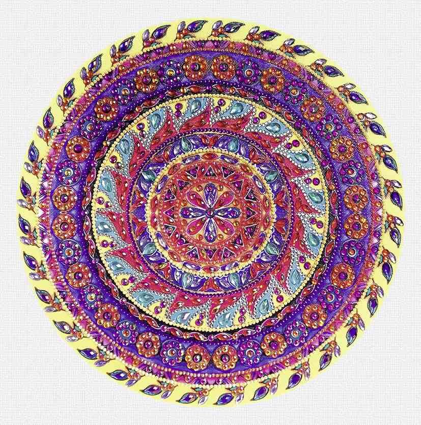 Diamanten Mandala zum Selbstgestalten in den Farben Gelb. Lila und Pink