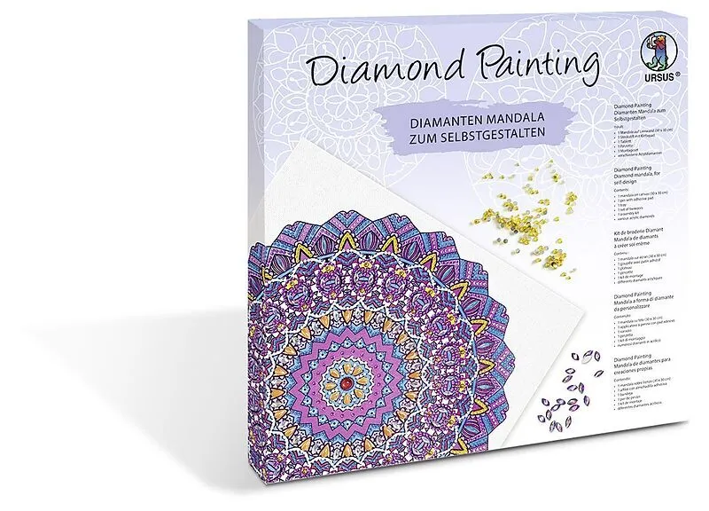 1 Mandala auf Leinwand (30 x 30 x 1,5 cm), 1 Steckstift mit Klebepad, 1 Tablett, 1 Pinzette, 1 Montageset und verschiedene Acryldiamanten.