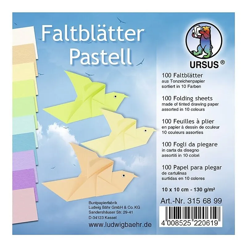 100 Faltblätter aus Tonzeichenpapier (130 g/m, Format: 10 x 10 cm, sortiert in 10 Pastellfarben) - "Made in Germany" URSUS-Qualität: durchgefärbt, hohe Farbbrillanz und Lichtbeständigkeit 100 Blatt