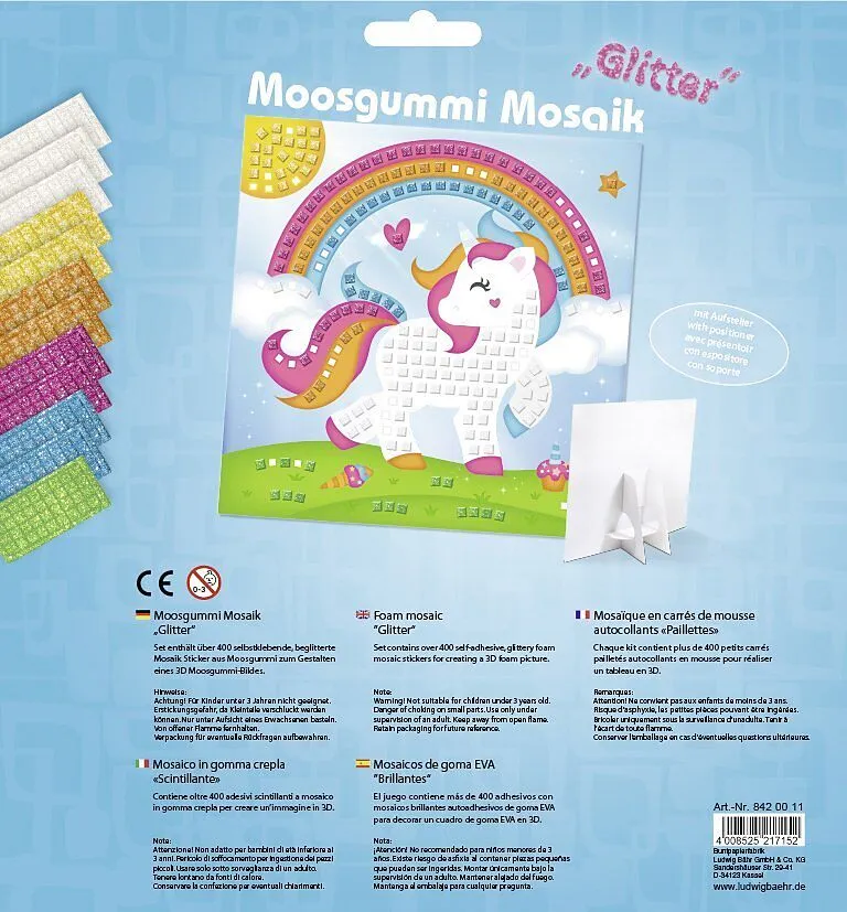 Set zum Gestalten eines MoosgummiBildes (Größe: 25 x 25 cm). Verpackung mit Euro-Lochung. 1 Vorlage, 1 Aufsteller und 432 Moosgummisticker sortiert in verschiedenen Farben inklusive Bastelanleitung Inhalt Inhalt: Set enthält Materialien uzum Gestalten eines Mo...