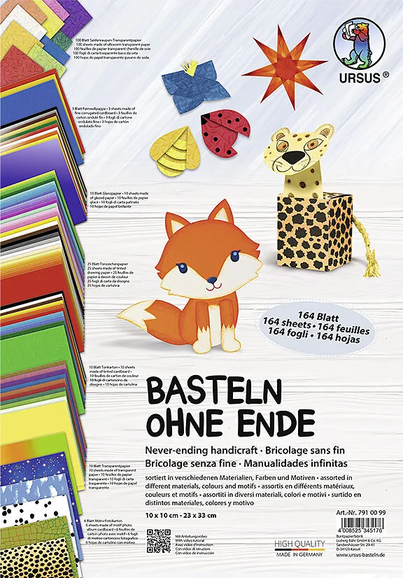 64 Blatt (Format 23 x 33 cm) sortiert in verschiedenen Materialien, Farben und Motiven & 100 Faltblätter (Format 10 x 10 cm) sortiert in 10 Farben - URSUS-Qualität: aus Frischzellulose und teils durchgefärbt, daher hohe Farbbrillanz und Lichtbeständigkeit Inkl...