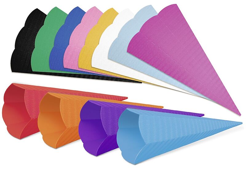 Set enthält fünf Schultüten (Höhe 41 cm, Durchmesser 15 cm) aus 3D-Colorwellpappe (260 g/m) in einer Farbe, 6-eckig. - "Made in Germany"