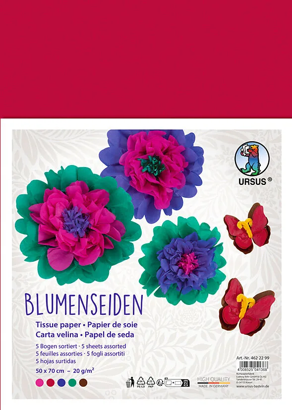 Seidenpapier Mit der Blumenseide von URSUS können Sie Ihrer Kreativität freien Lauf lassen. Ideal zum Basteln von Blumen und vielem mehr! Blumenseide ist nicht nassfest und kann abfärben! In der Sortierung sind die Farben pink, dunkelblau, dunkelrot, dunkelgr...