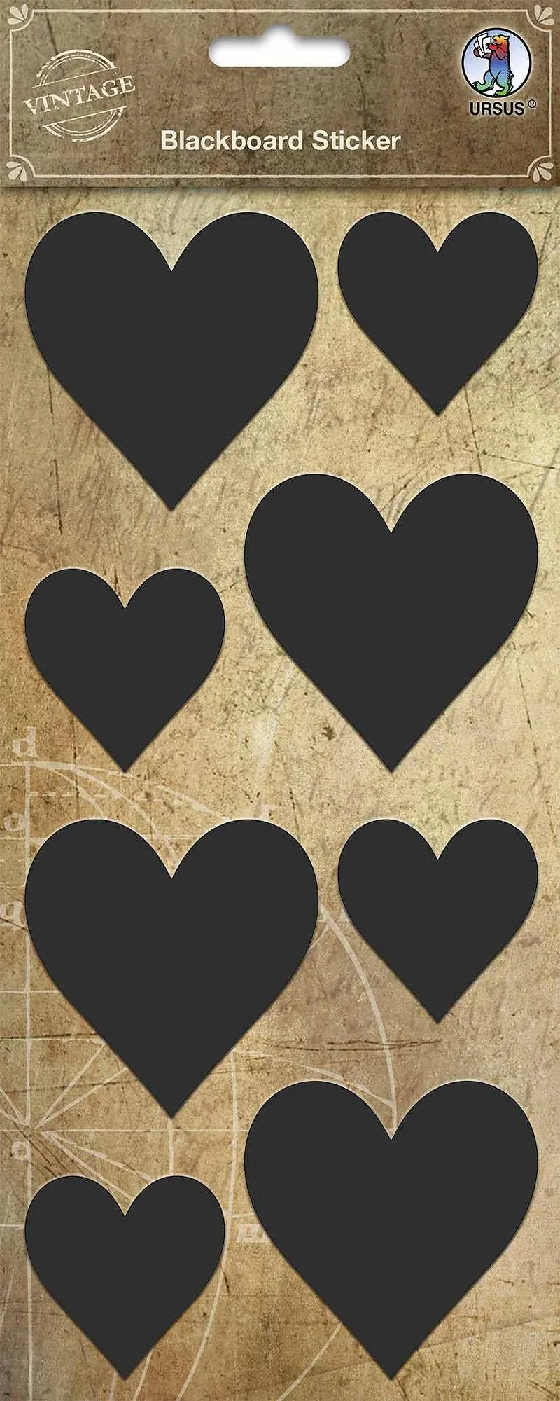 Blackboard-Sticker in verschiedenen Formen (matt schwarz mit strukturierter Oberfläche) URSUS-Qualität: beschreibbar mit Kreide, Speckstein und Buntstiften; abwaschbar; selbstklebend - Verpackung mit Euro-Lochung. 2 Stickerbogen (12 x 26 cm) mit jeweils 8 Stic...
