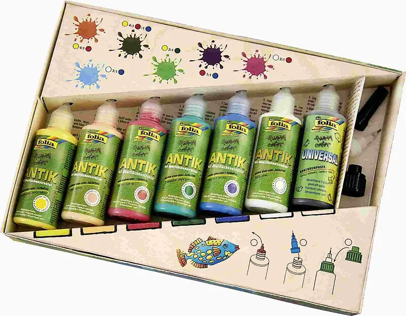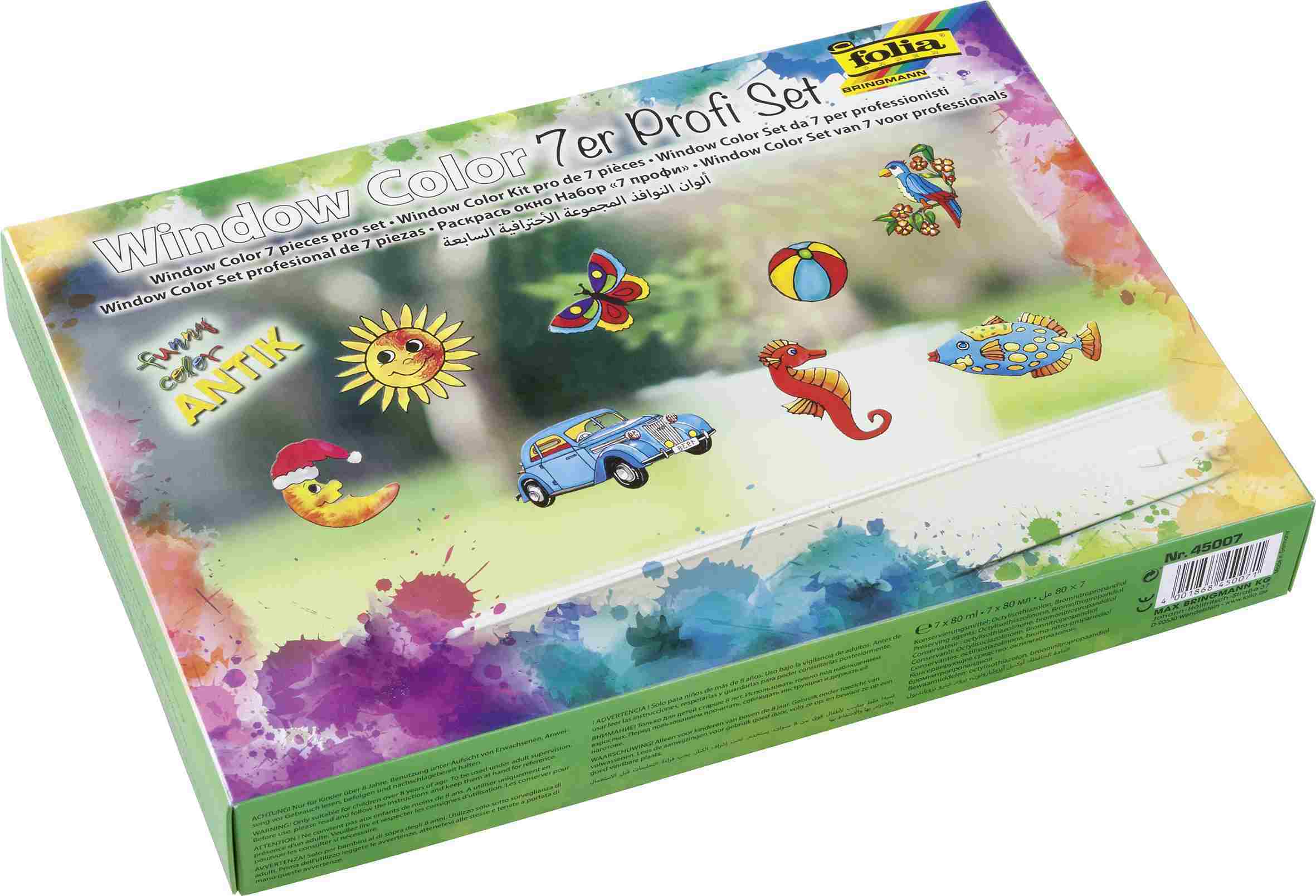 Folia - Window Color Funny Color Antik Profi Set 6 Farben + 1 Konturen Inhalt: 1 Kuntur schwarz 80 ml, 6 Grundfarben 80 ml: rot, gelb, blau, haut, grün, weiß. 1 Malspitze mit Verschluss und Kappe, für dünne Konturen. 1 Malplatte DIN A4. 20 Malvorlagen. 1 Misch...