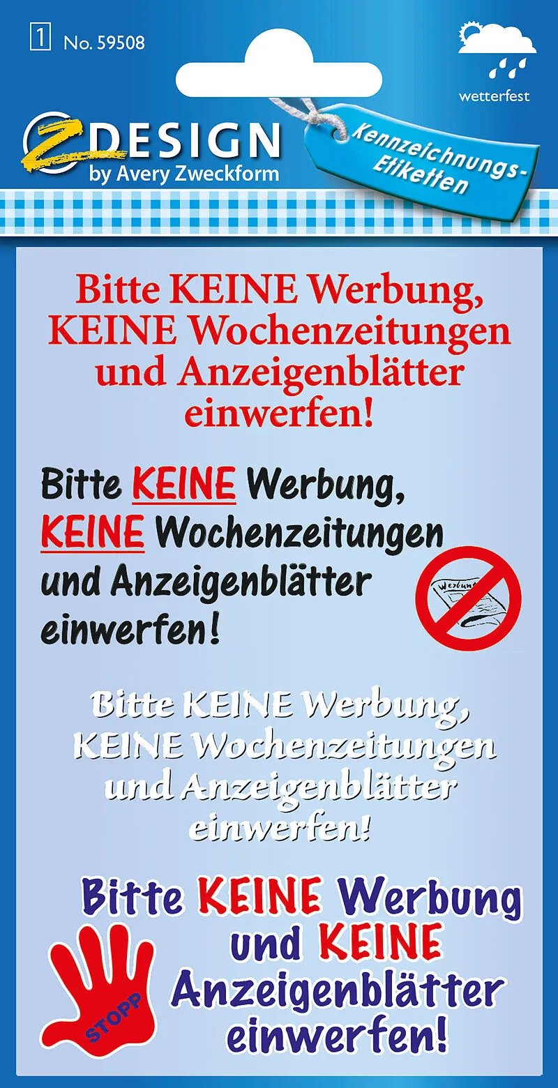 Hinweisetiketten Mit den Z-Design Hinweisetiketten "Keine Werbung" machen Sie am Briefkasten deutlich, dass Sie keine Werbesendungen annehmen möchten. Die wetterfesten Aufkleber gibt es in verschiedenen Designs, Farben und Materialien passend für je...