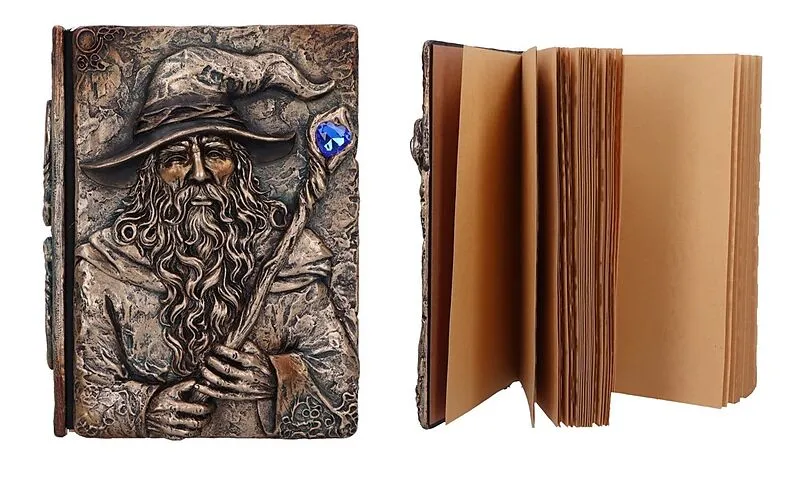 Ein mystisches Zauberer-Grimoire-Tagebuch im verwitterten Look. Perfekt zum Schreiben von Zaubersprüchen, Geschichten oder persönlichen Betrachtungen. Das Tagebuch umfasst 92 leere Seiten und einen detailreichen Zauberer aus Harz mit einem Zauberstab, der mit ...