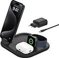 Laden Sie Ihre wichtigsten Geräte mit einem praktischen einklappbaren Ständer. Mit dieser Ladestation laden Sie nicht nur Ihr iPhone 15, 14, 13 oder 12 schnell kabellos mit 15 W auf, sondern auch Ihre Apple Watch sowie AirPods mit 5 W. Dank der magnetischen Qi...