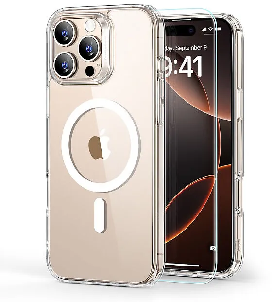 CLASSIC HYBRID - Case MagSafe + Glass Kompatibilität: nur für iPhone 16 Pro Max; Im Lieferumfang enthalten: 1 durchscheinendes, mattes Gehäuse, 1 Displayschutzfolie aus gehärtetem Glas, 2 Sätze austauschbarer Easy-Press-Tasten und 1 Ausrichtungsrahmen Umfasse...
