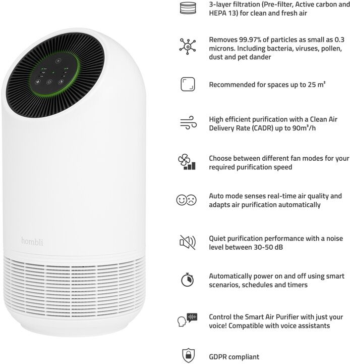 Atmen Sie mit dem stilvollen Hombli Smart Air Purifier immer gesunde und saubere Luft ein. Dieser kleine, aber leistungsstarke Luftreiniger entfernt bis zu 99,97 % aller Bakterien, Viren, Pollen, Tierschuppen und anderer schädlicher Partikel in Räumen von bis ...