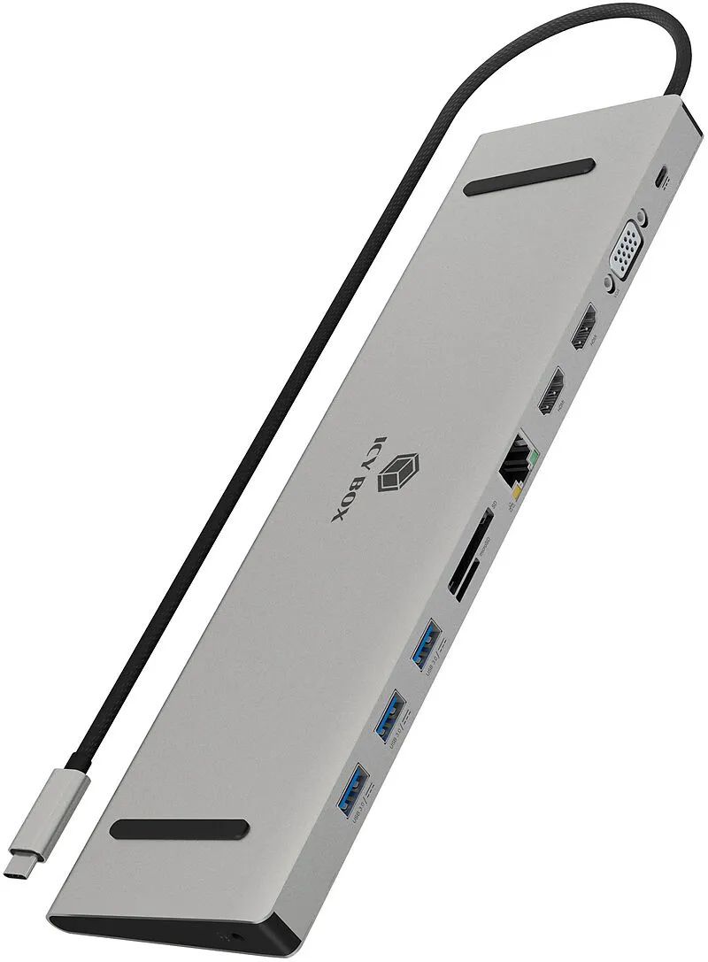 USB Type-C Dockingstation PERFEKT VERBUNDEN: ICY BOX DockingStation mit 3x USB Type-A USB 3.0, 2x HDMI®, 1x VGA, 1x Kartenleser für SD/-microSD-Karten, 1x Gigabit LAN RJ45, 1x Audioeingang/-ausgang sowie einem USB Type-C® Ladeanschluss. ERGONOMISCH ARBEITEN: ...
