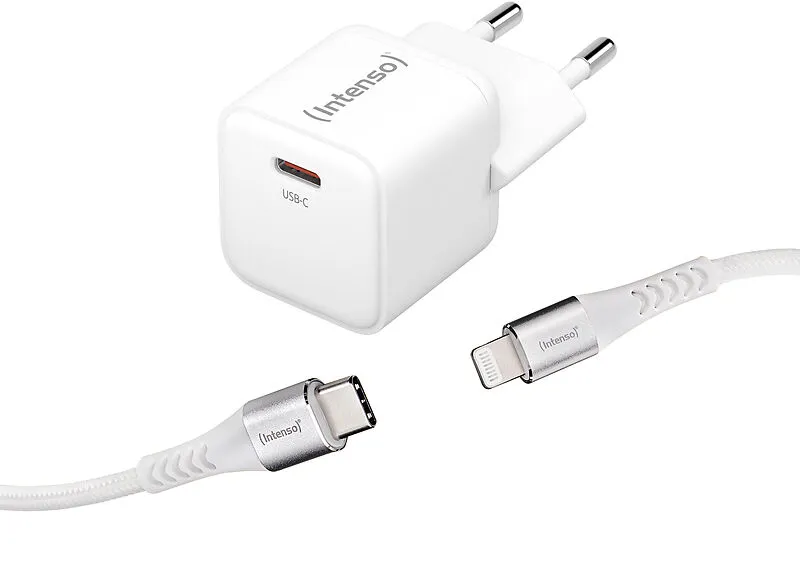 INTENSO Power Charger W30C GaN 1x USB-C + C315L Cable USB-C - Lightning white Perfektes Duo: GaN Power Adapter mit USB-C zu Lightning Kabel Mach dich bereit für beeindruckende Ladegeschwindigkeiten mit unserem zuverlässigen W30C GaN Power Adapter und dem exkl...