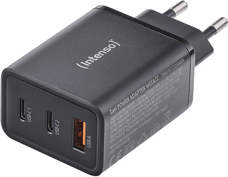 INTENSO Power Adapter W65ACC GaN black Mit 65 Watt Leistung ist der Intenso W65ACC ein echtes Kraftpaket unter den Ladegeräten und die ideale All-in-one-Lösung für dein technisches Zubehör. Ausgestattet mit zwei USB-C-Anschlüssen und einem USB-A-Anschluss ver...