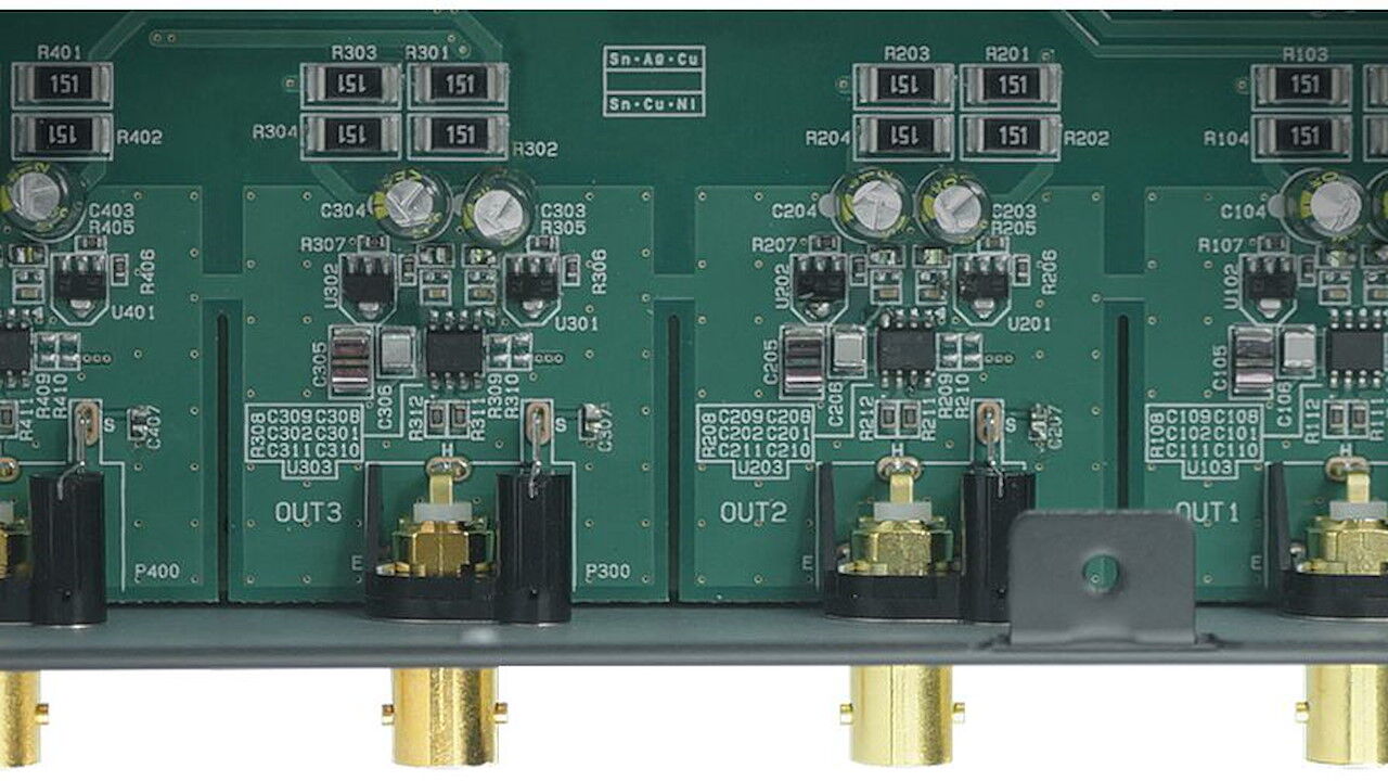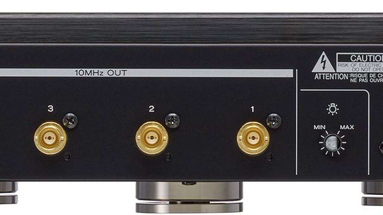 Vier vergoldete BNC-Anschlüsse (50 Ohm) sind vorhanden, um Taktsignale an mehrere Geräte zu liefern. Es können bis zu vier Geräte, die einen 10MHz-Eingang unterstützen, gleichzeitig angeschlossen werden, darunter USB-DACs, Netzwerk-Player und SA-CD-Player.