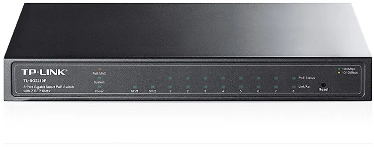 TL-SG2210P 8 Port Gigabit 2 SFP Slots Smart PoE Switch Der TL-SG2210P verfügt über 8 Gigabit-LAN-Ports die eine Gesamtleistung von 53W zur Verfügung stellen, um PoE-fähige Endgeräte wie Accesspoints oder IP-basierte Überwachungskameras mit Strom zu versorgen....
