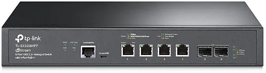 TL-SX3206HPP JetStream 6 Port 10GE L2+, 4-Port PoE++Managed Switch Bauen Sie Ihr blitzschnelles Netzwerk auf und erweitern Sie es mit dem TP-Link TL-SX3206HPP - einem vollständig verwalteten Switch mit vollen 10GE RJ45- und Glasfaser-Ports und 120 Gbit/s Swit...