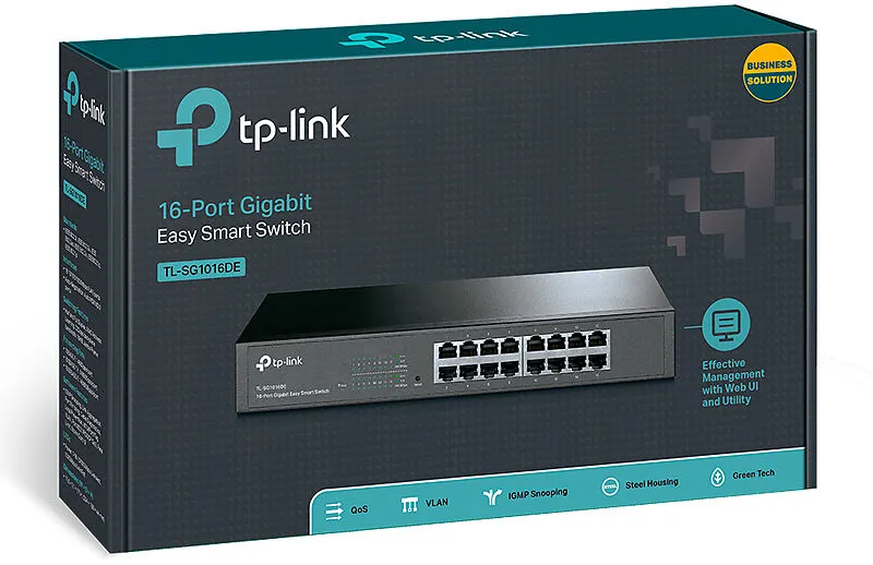 TL-SG1016DE, 16 Port Gigabit Easy Smart Switch Der 16-Port-Gigabit-Easy-Smart-Switch TL-SG1016DE bietet kleinen und mittelgrossen Unternehmen eine einfache Möglichkeit, den Übergang zum Gigabit-Ethernet zu wagen. Dem Administrator bietet der Switch Basisfunkt...