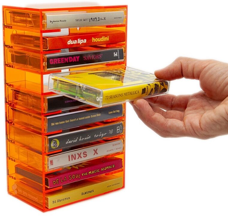 Hast du eine Kassettensammlung angelegt oder ein paar alte Mixtapes vom Dachboden ausgegraben? Jetzt kannst du sie stilvoll aufbewahren! In diesem Acryl-Kassettenhalter finden bis zu 10 Kassetten Platz. Er kann an der Wand montiert oder einfach auf einer Tisch...