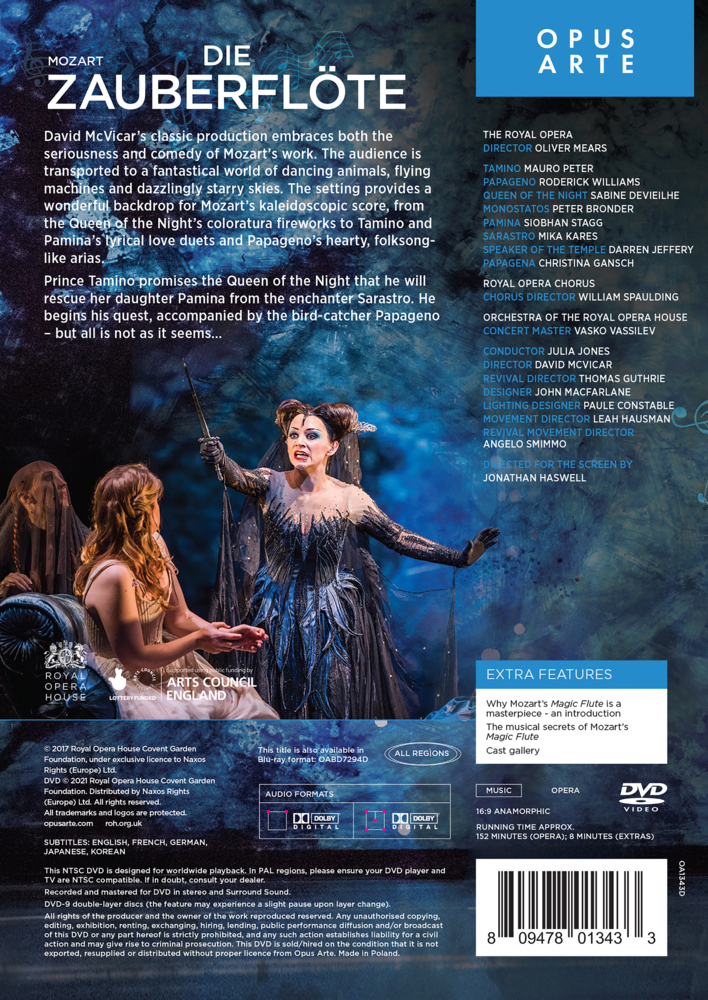 Mauro Peter (Tamino) - Siobhan Stagg (Pamina) - Roderick Williams (Papageno) - u.a. - Orchestra of the Royal Opera House - Julia Jones (Dir) // David McVicars Inszenierung der "Zauberflöte" beleuchtet sowohl die ernsthaft-philosophische als auch die komödianti...