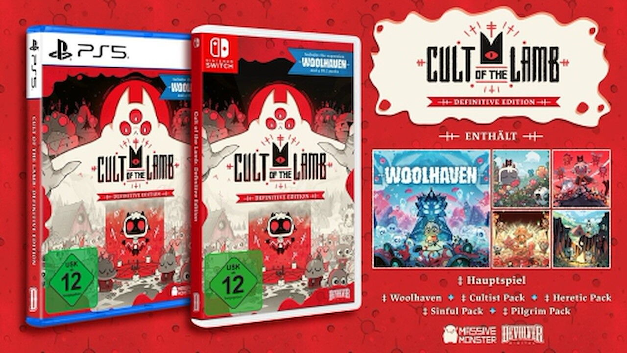 Cult of the Lamb: Definitive Edition enthält das vollständige Basisspiel sowie das Kultistenpaket, Heretic Pack, Sinful Pack, Pilgrim Pack, Woolhaven DLC und das Unholy Alliance Update - alles gebündelt und vollständig auf der Cartridge/Disc verfügbar!