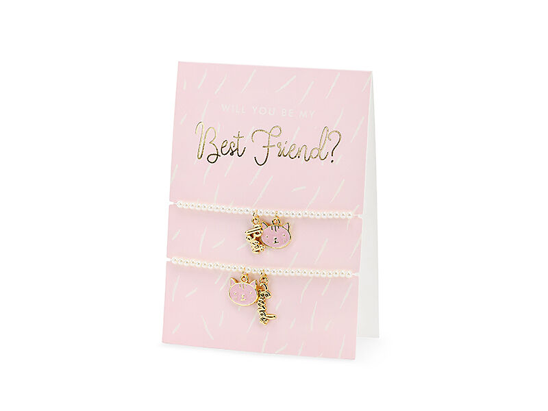 Rosa Karte mit der Aufschrift ''Will you be my Best Friend?'' und zwei Armbändern sowie einem weißen Umschlag mit buntem Aufdruck.
