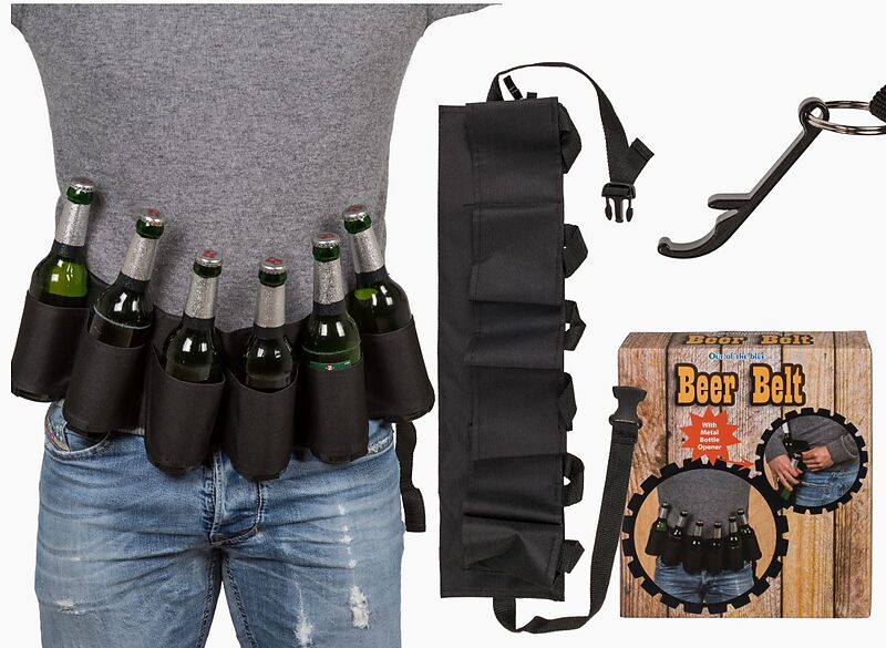 Endlich ein robuster Flaschenhalter womit sich 6 Flaschen/Dosen perfekt verstauen lassen. Der gesamte Gürtel misst 124 cm und ist zusätzlich mit einem Metall-Flaschenöffner ausgerüstet. Das perfekte Accessoire für Ferien, Openairs, Polterabende und sonstige Fe...