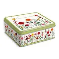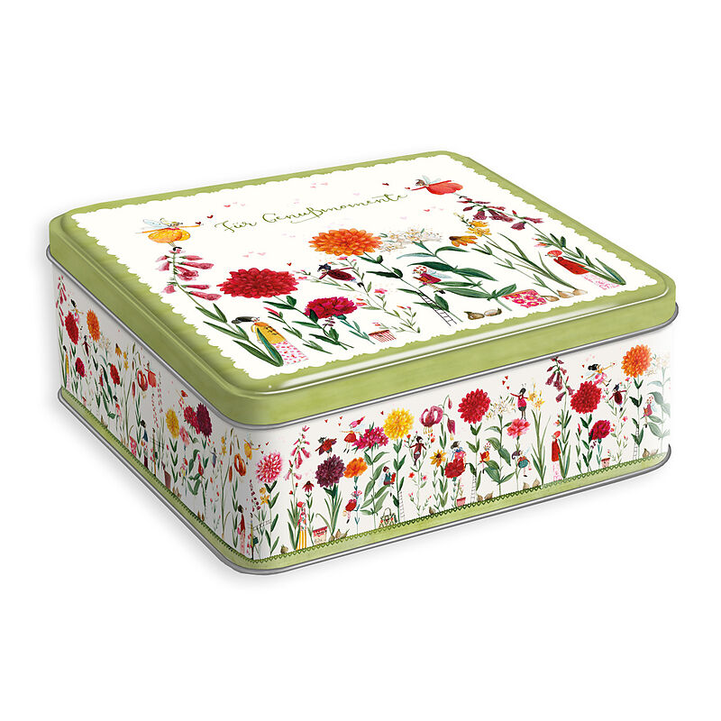 19 x 19 x 7,5 cm aus Blech Schöne Dose die vielseitig einsetzbar ist. Ob als Verpackung für ein kleines Geschenk oder als Aufbewahrung für Krimskrams, sie passt einfach immer.