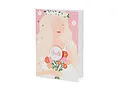 Farbige Karte mit goldmetallisiertem Druck, mit einer Anstecknadel mit dem Wort "Bride" und einem weißen Umschlag mit goldmetallisiertem Druck, Kartengröße ca. 10,5 x 15 cm, Anstecknadelgröße ca. 3,5 x 3,5 cm.