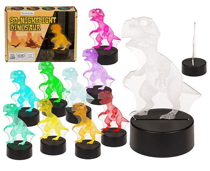 3D-Nachtlicht & Dekolampe. Dieser faszinierende 17 cm grosse Dino leuchtet nach Zufalls-Prinzip in sechs verschiedenen Farben. Der langsame Farbwechsel wirkt magisch und beruhigend. Ein Nachtlicht von dem die Kinder begeistert sind. Material Kunststoff, 3 Mign...