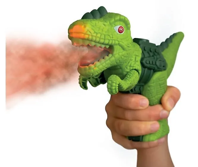 Ein brüllendes + fauchendes Gadget für Dino-Fans! Der unheimliche,rauchige Atem wird mit einfachem Wasserdampf erzeugt. Mit der mitgelieferten Pipette Wasser einfüllen und auf den Auslöser drücken und du siehst, wie der rote, feurige Atem aus dem Maul des Dino...