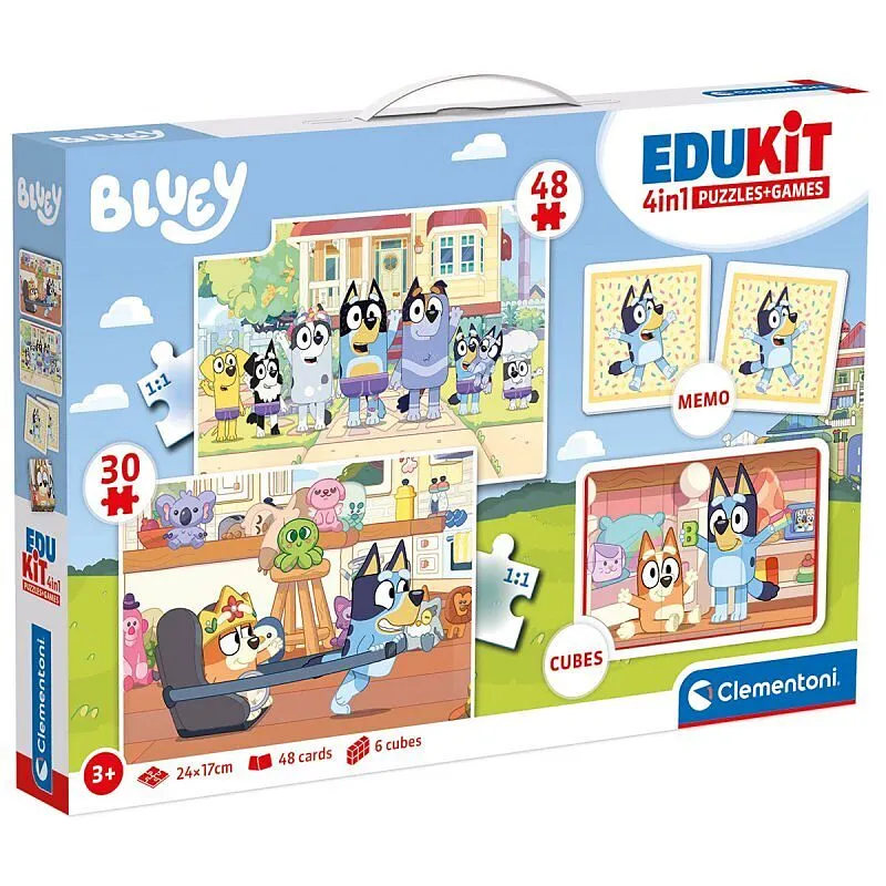 Bei dieser Spielesammlung unterschiedlicher Lernspiele kommt niemals Langeweile auf. Die Box ist ausgestattet mit einem 30 und 48 teiligen Puzzle, einem Memo und mit einem 6er Würfelpuzzle. Alles zum Thema Bluey. Ein herrliches Vergnügen für Kinder.
