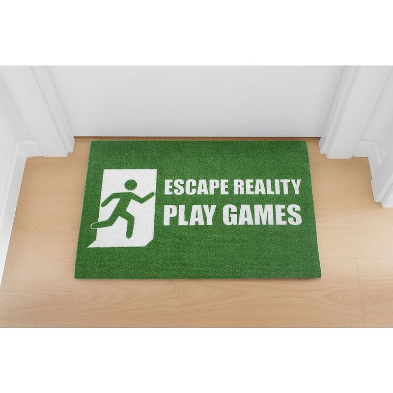 Manchmal hat man die Schnauze voll vom Alltag und flüchtet sich in seine virtuelle Gamer-Welt. Die lustige Fußmatte sieht aus wie ein klassisches Exit-Schild mit Piktogramm. Die Matte kommt ohne Rand und kann so auch in der Wohnung als kleiner Teppich verwende...