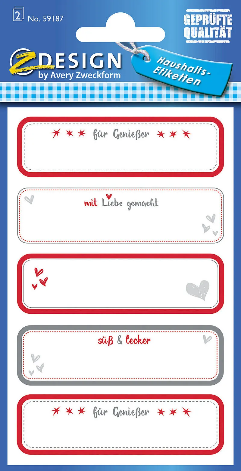 praktische Etiketten aus beschriftbarem und wiederablösbarem Papier. Zum Kennzeichnen von Vorräten. Inhalt: 10 Etiketten / 2 Bogen Sticker-Verpackungsgrösse: 16 x 8 cm