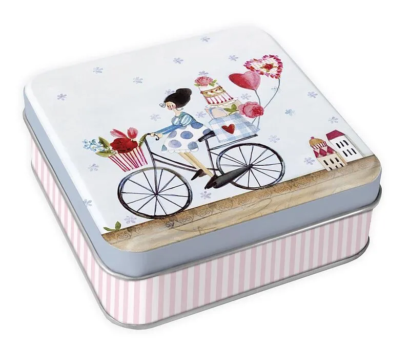 10 x 10 x 3.5 cm aus Blech Schöne Dose die vielseitig einsetzbar ist. Ob als Verpackung für ein kleines Geschenk oder als Aufbewahrung für Krimskrams, sie passt einfach immer.