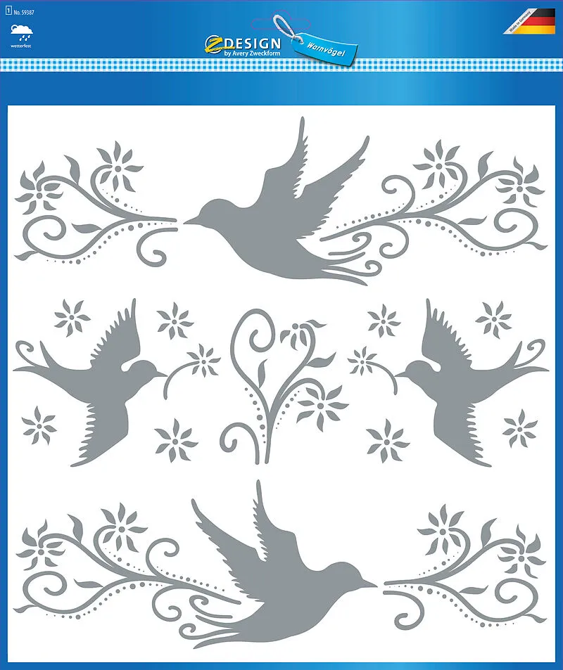 Bedruckte selbsthaftende Folie, wetterfest. Macht Fenster und Glastüren sichtbar und schützt Vögel vor Kollisionen. Inhalt: 1 Bogen Sticker-Verpackungsgrösse: 28 x 29 cm