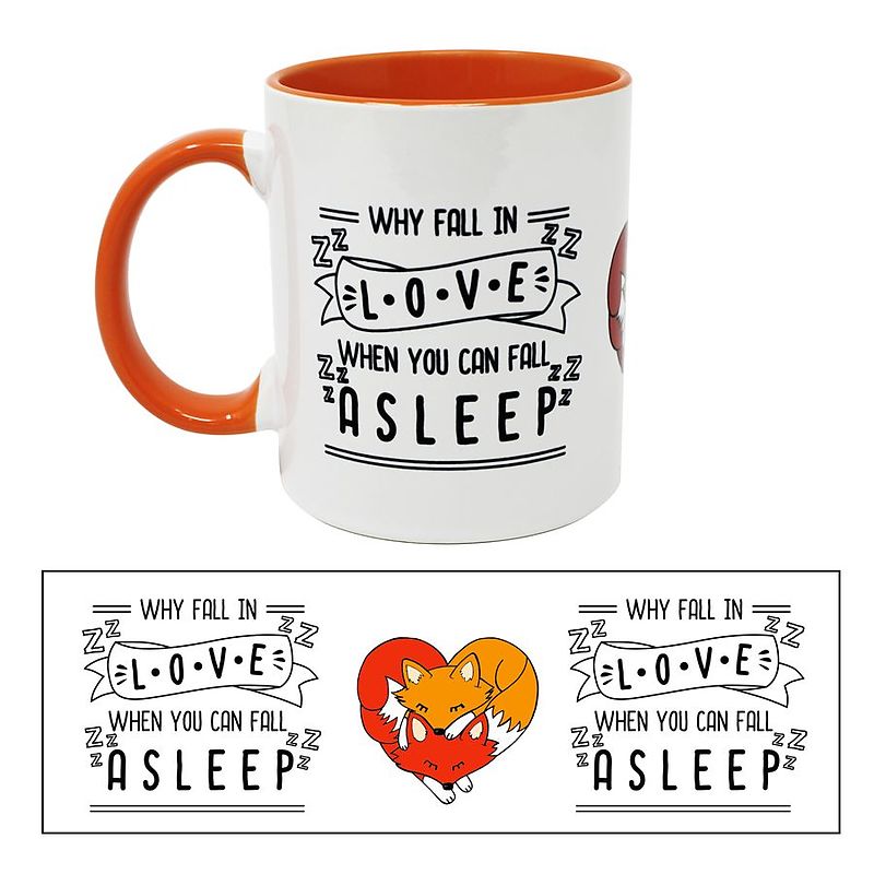 weiß-orange, aus Keramik, spülmaschinenfest. Motiv: Why Fall in Love, when You can Fall Asleep mit orangener Innenseite und orangenem Henkel Details: Sublimationsdruck Pflegehinweis: damit die Tasse möglichst lange hält, empfehlen wir Handwäsche Design made in...